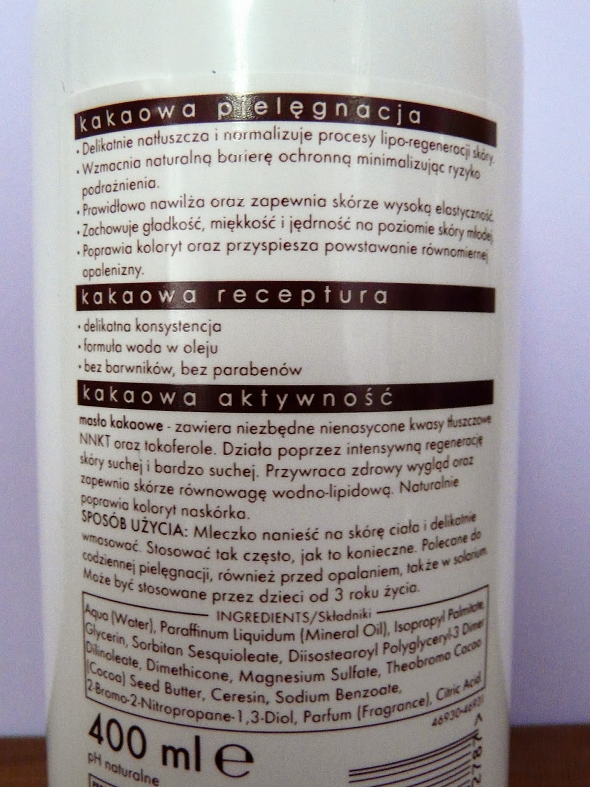 Witam Was :) ostatnio dość mocno się ochłodziło, co u mnie zawsze wiąże się z przesuszeniem skóry. Mleczka do ciała używałam też w wakacje, jednak później zaprzestałam na rzecz lżejszego balsamu a teraz znowu do niego powróciłam. Seria Ziai (chyba tak się to odmienia) Masło kakaowe ma przede wszystkim boski zapach, jakby rzeczywiście było tam dosypane prawdziwe kakao.