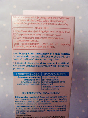 Producent obiecuje nam, że jest to bogaty krem nawilżający, do skóry bardzo suchej. Wszystkie kremy, których wcześniej używałam i miały w nazwie "bogaty" miały gęstą i treściwą konsystencję, tutaj też się tego spodziewałam, więc myślałam, że będzie to krem raczej na noc. Pomyliłam się, jest bardzo lekki, nietłusty, szybko wsiąka w skórę, idealny pod makijaż. Nie jest jakoś silnie nawilżający i nie sądzę, aby sprawdził się w rzeczywiście mroźną zimę np. na nartach. Kolejną kwestią jest to, że ma działać przeciw przesuszaniu, o ile dużego nawilżenia przy używaniu go nie widzę, tak przesuszenia też nie.