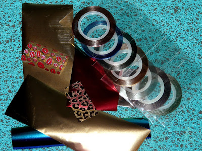 Na allegro kupiłam 6 striping tapes czyli tych cieniutkich tasiemek do ozdabiania paznokci, gratis dostałam kawałki folii transferowych i jedną taśmę :)