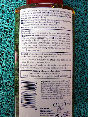 Od dawna szukałam czegoś pod prysznic, co by zostawiało na skórze warstewkę, dzięki której nie musiałabym już używać balsamu. Więc ucieszyła mnie promocja w SuperPharmie i mogłam kupić olejek pod prysznic od Eucerin za dychę. Konsystencja jest całkiem fajna, przypomina mi połączenie żelu pod prysznić z olejkiem, no ale cóż na opakowaniu jest tylko "olejek". Aplikacja nie jest upierdliwa, nie przelewa się przez palce, tylko pozostaje na dłoni, wanna też nie jest potem tłusta. Po nałożeniu na mokra skórę delikatnie się pieni. Producent obiecuje ochronę przed wysuszaniem, ja nic takiego nie zauważyłam, po myciu dalej potrzebuję balsamu, więc czym ten olejek różni się od tradycyjnego żelu pod prysznic? Szczerze mówiąc chyba tylko wyższą ceną. Do tego ma dość nieprzyjemny rybi zapach.