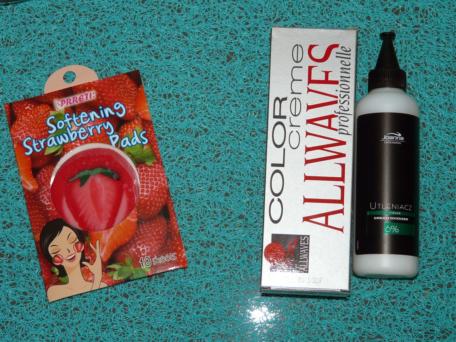 W Hebe tylko płatki w wersji truskawkowej, od dawna mnie ciekawiły i w końcu się skusiłam. Do tego moja farba, która starczy mi na 2 razy, bo robię tylko odrosty :).