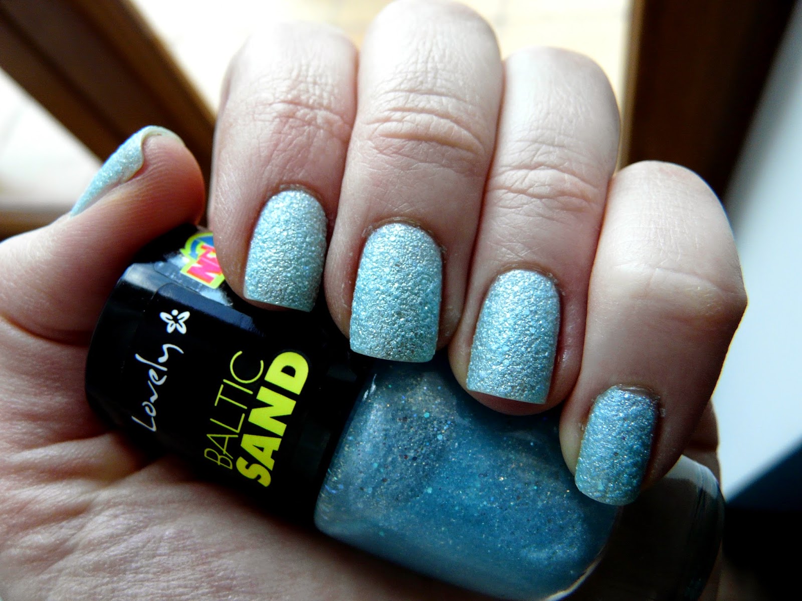 Dziś pierwszy post o jednym z moich lakierowych nabytków z promocji -49%. Nowy piasek z serii Baltic Sand od Lovely. Nr 7 to piękny błękit, posiadający błyszczące drobiny różnej wielkości. To co widzicie na zdjęciu to dwie warstwy. Lakier ma dość śmieszną konsystencję, przez nagromadzenie drobinek sprawia wrażenie jakby malowało się paznokcie pianką.